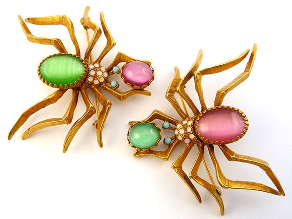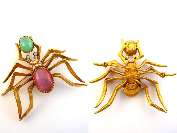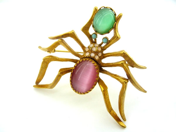Великолепная крупная объемная брошь в виде паучка выполнена из сплава на основе латуни и покрыта позолотой в 24 К. Декор - два крупных овальных кабошона из стекла розового и зеленого цветов, чьи мерцающие переливы напоминают лунный камень. Тельце декорировано мелкими кристаллами под опал. Глазки - вставки под бирюзу.Состояние: новое. Маркировано. Размер: высота - 6 см, ширина - 6,5 см, глубина - 1,5 см. Лимитированные украшения ASKEW LONDON изготовлены из самых лучших материалов: винтажные хрустальные стразы Австрии, Германии, Франции, Чехословакии, художественное японское и китайское стекло, полудрагоценные камни. Базовым металлом является латунь, покрытая либо 24К золотом, либо серебром.